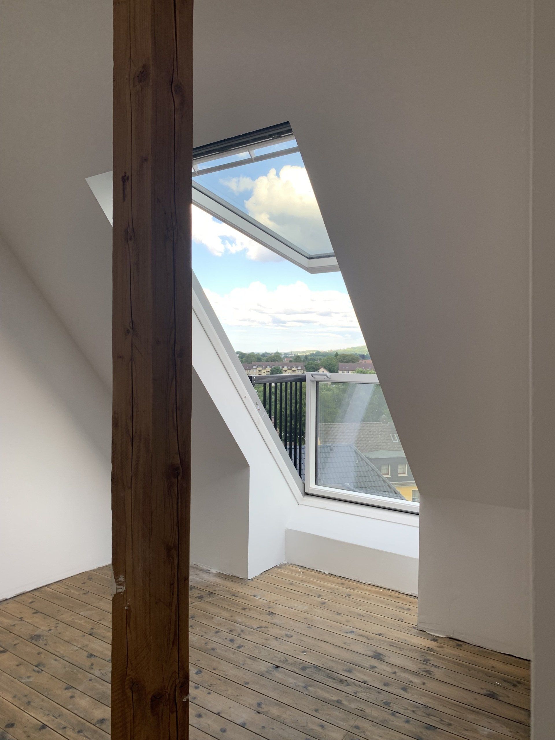 Wie auf dem Grundriss zu sehen, wurde der Spitzboden des Hauses vollständig und aufwendig ausgebaut, inklusive vieler Dachfenster - unter anderem auch ein 1,5m breites Velux Cabriofenster, welches als kleiner Balkon dient und einen tollen Ausblick bietet. Der alten Holzdielenboden und die Holzbalken harmonieren perfekt mit den neuen weißen glatten wänden.